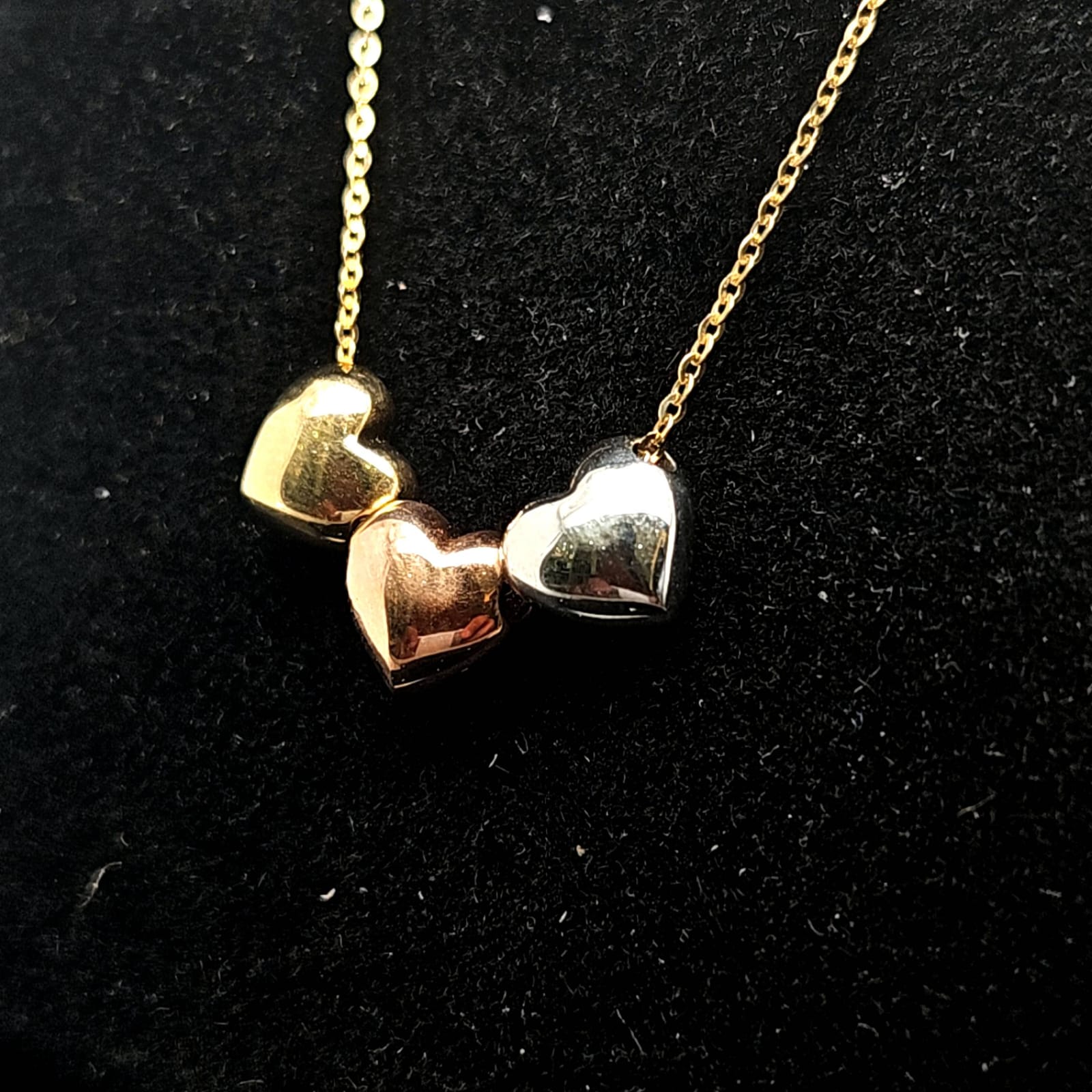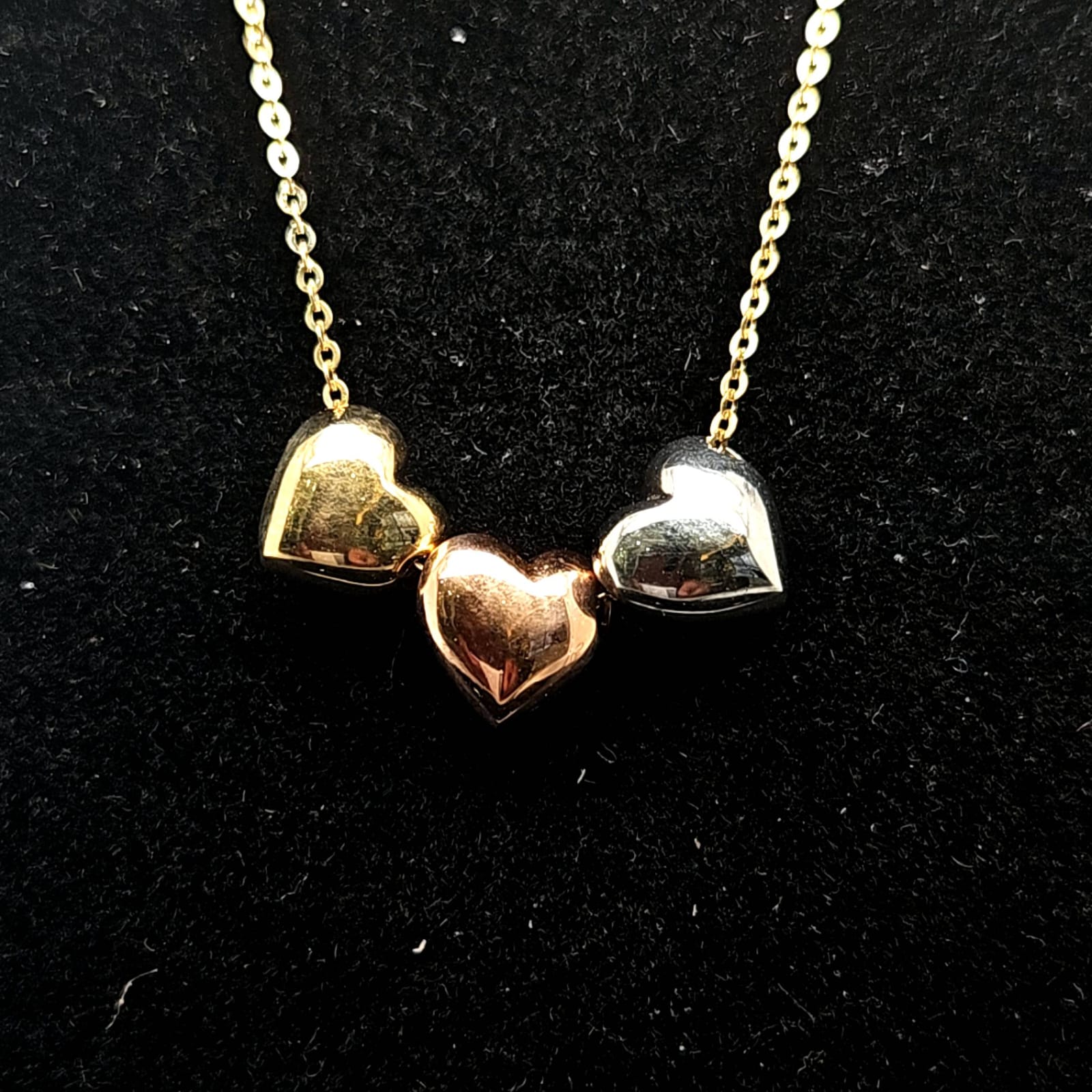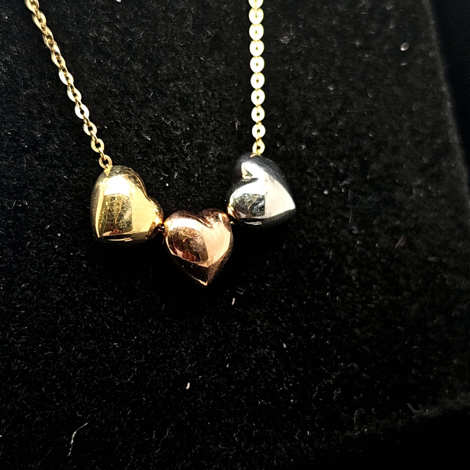 Illuminate your love with 3 HEARTS. This gorgeous tricolor heart pendant necklace in 14K gold combines elegance and affordability, making it the perfect gift for any special occasion. Show your loved ones how much they mean to you with this exquisite and affordable piece.