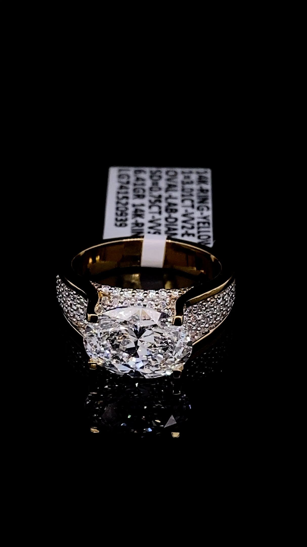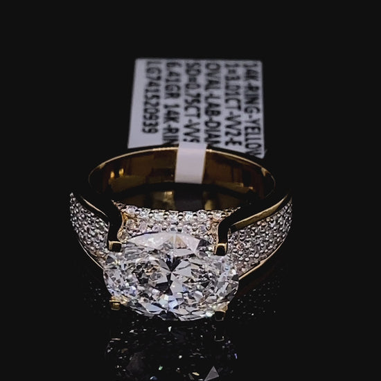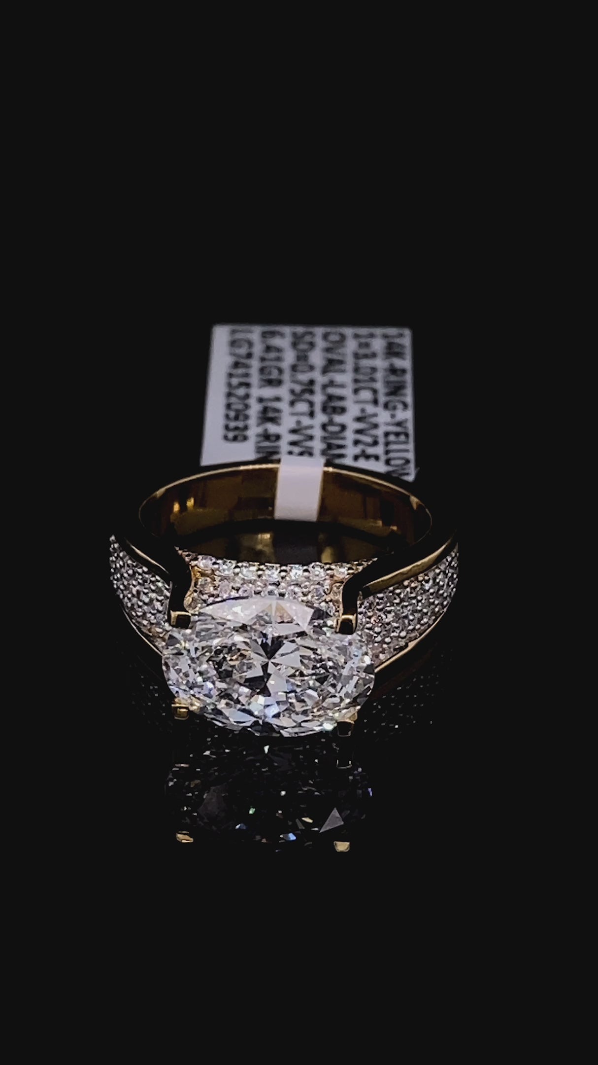 Discover timeless elegance with this stunning 14K gold ring, featuring a magnificent 30.1ct oval lab diamond as its centerpiece, vertically set for maximum brilliance. The substantial band showcases a continuous cascade of diamonds, while an exquisite bridge gracefully supports the center stone. This expertly crafted piece combines sophisticated design with exceptional sparkle, making it an ideal choice for those who appreciate fine jewelry and enduring beauty.