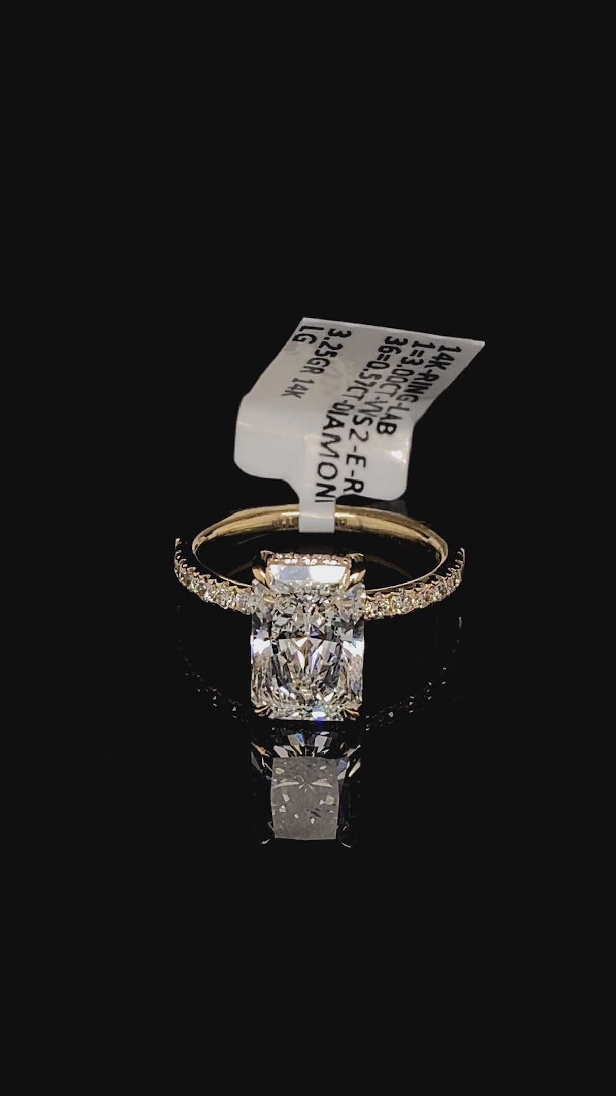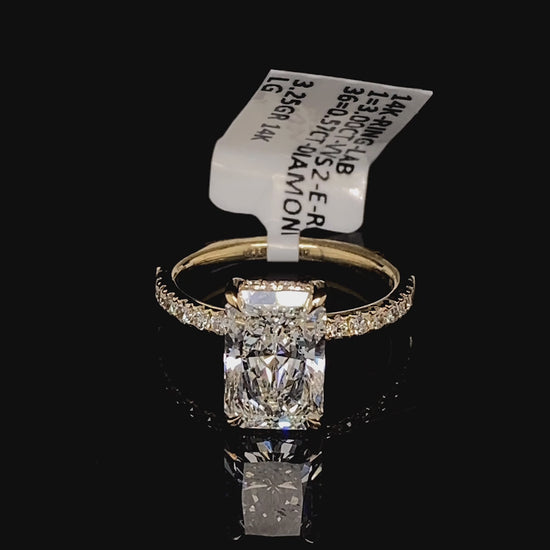 Elevate your engagement with this stunning 14K gold ring, featuring a magnificent 3-carat lab-grown radiant diamond at its center, complemented by 0.57 carats of accent diamonds along the band. Each stone is meticulously selected for VVS clarity and E-F color grades, delivering exceptional brilliance and sparkle. Lab diamonds offer the same optical and physical properties as mined diamonds while providing excellent value. This sophisticated design combines timeless elegance with modern craftsmanship, creating a piece worthy of your most precious moments.