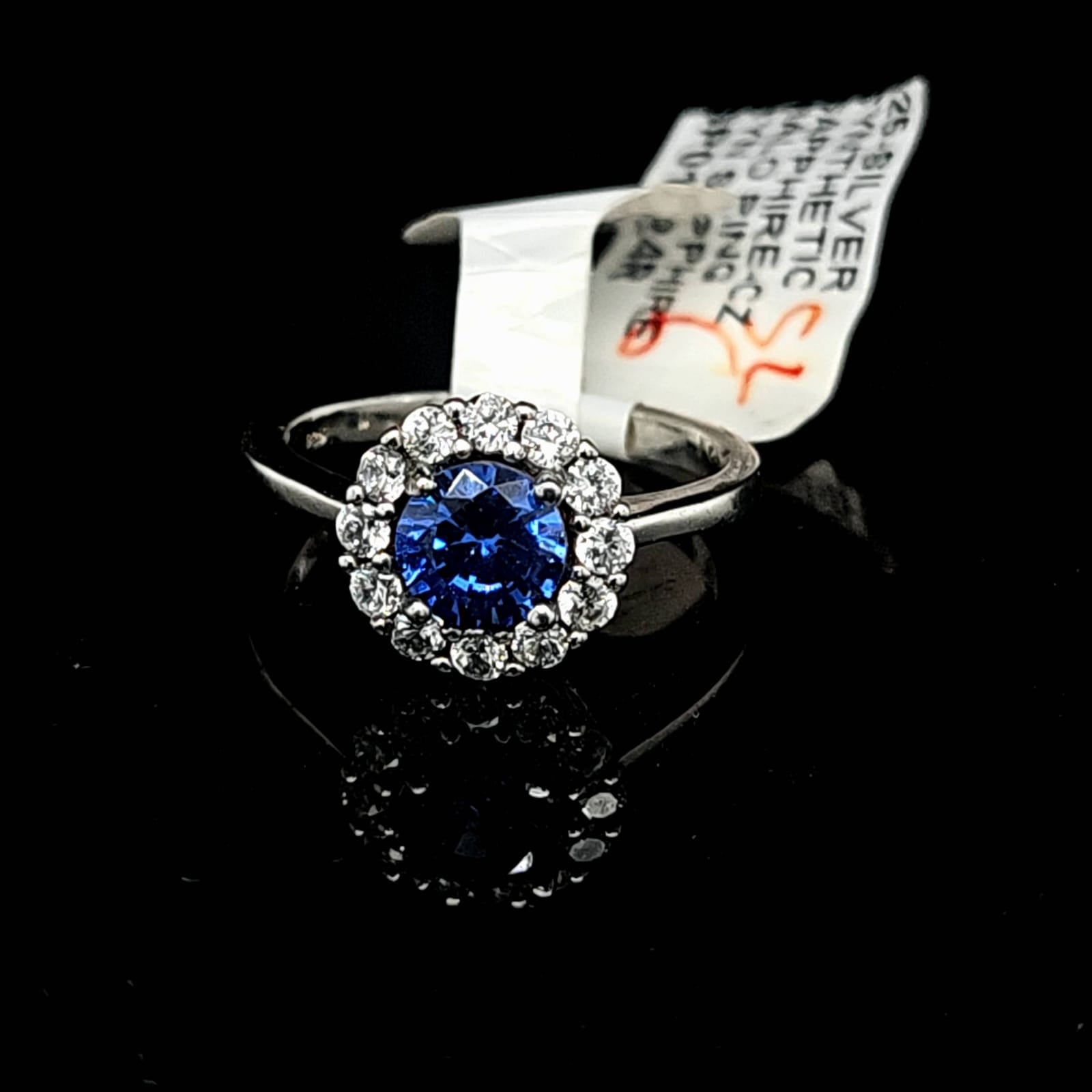 This stunning 925 silver ring features a synthetic blue sapphire center stone surrounded by a halo of sparkling CZ stones. Add a touch of elegance and sophistication to any outfit with this beautiful ring. Perfect for any occasion, it is sure to make a statement.