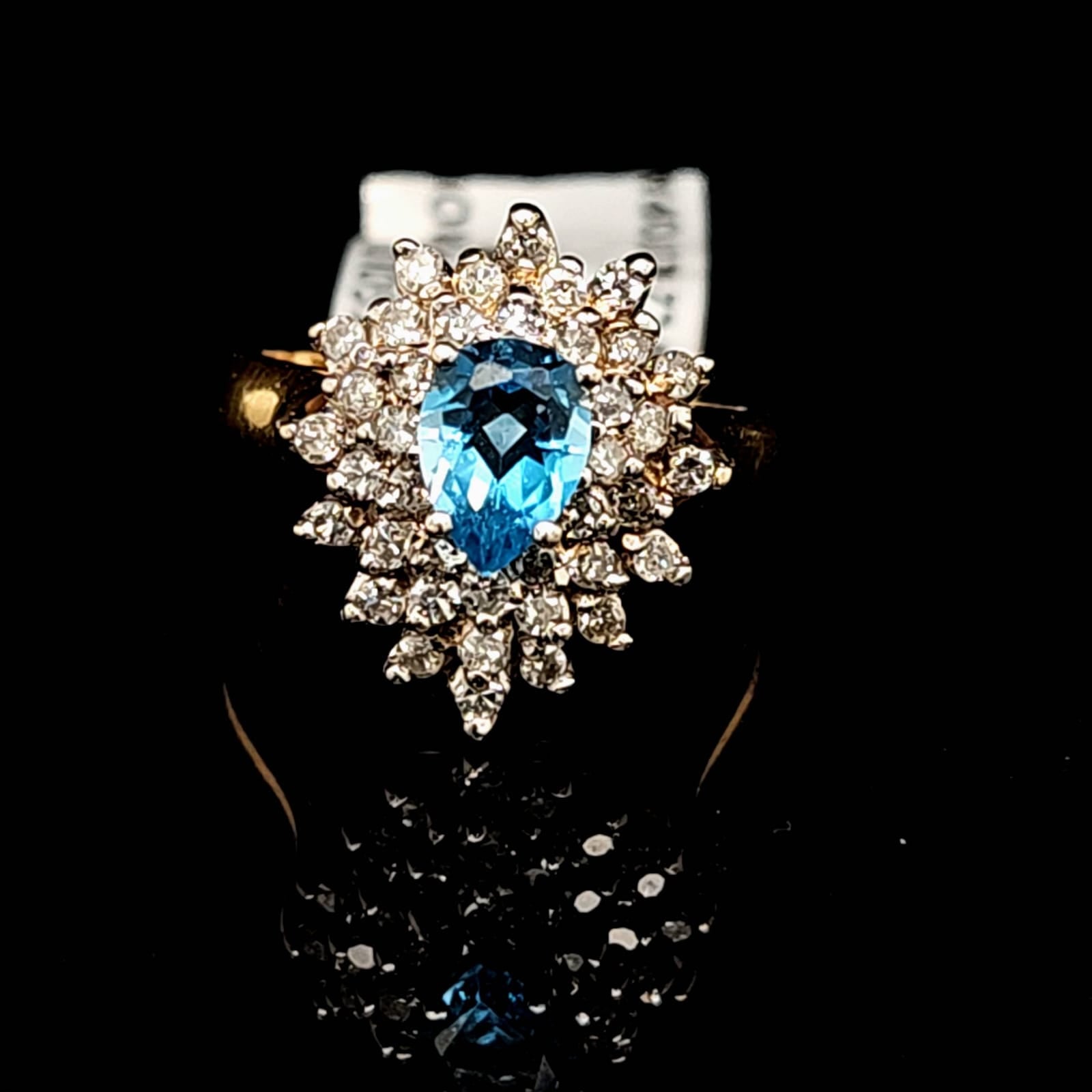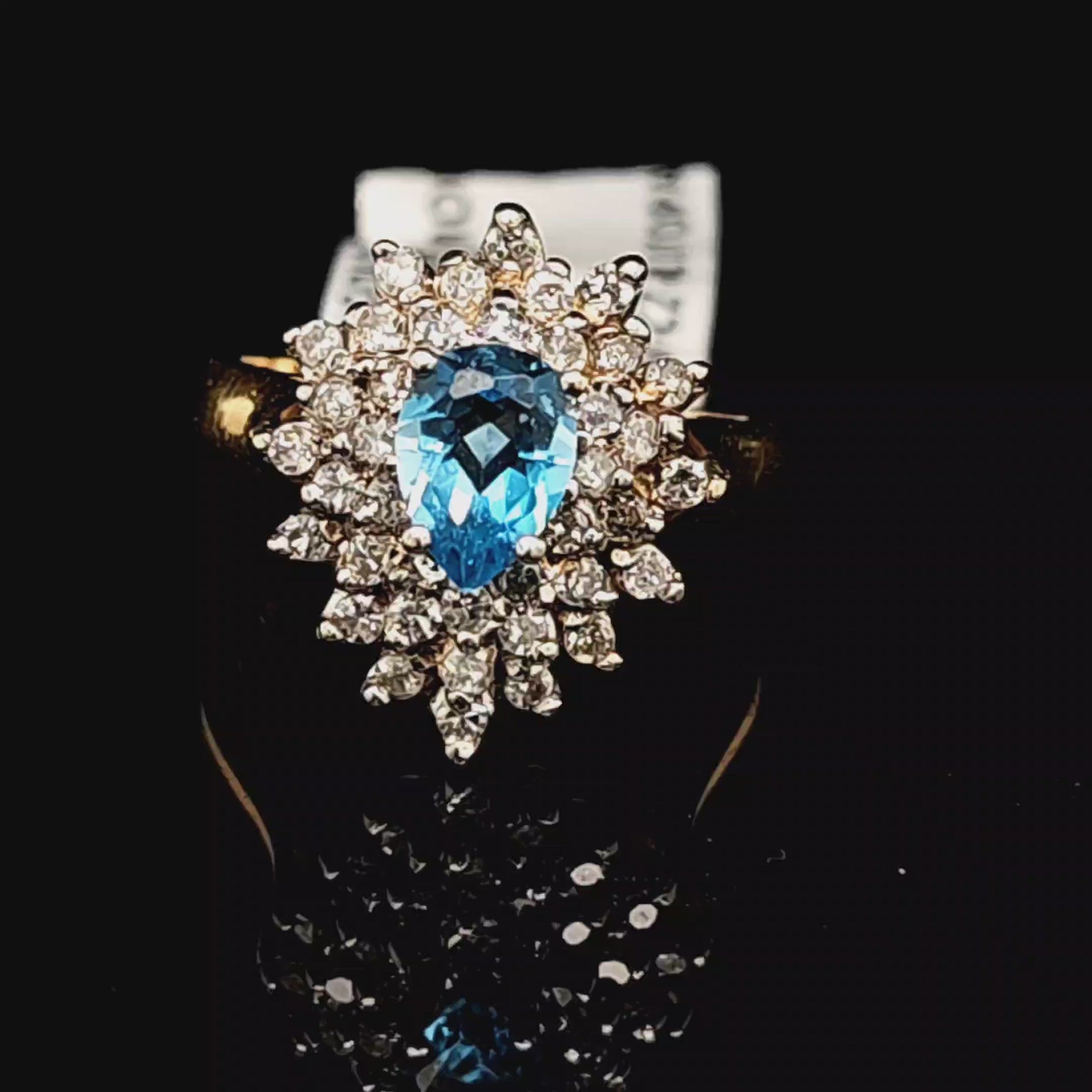 Introducing BLUR TOPAZ - a stunning ring featuring a center blue topaz and .57ct natural diamonds on the sides with 14k gold. Elevate your style with this affordable, on-trend piece. A must-have for any fashion-forward individual.