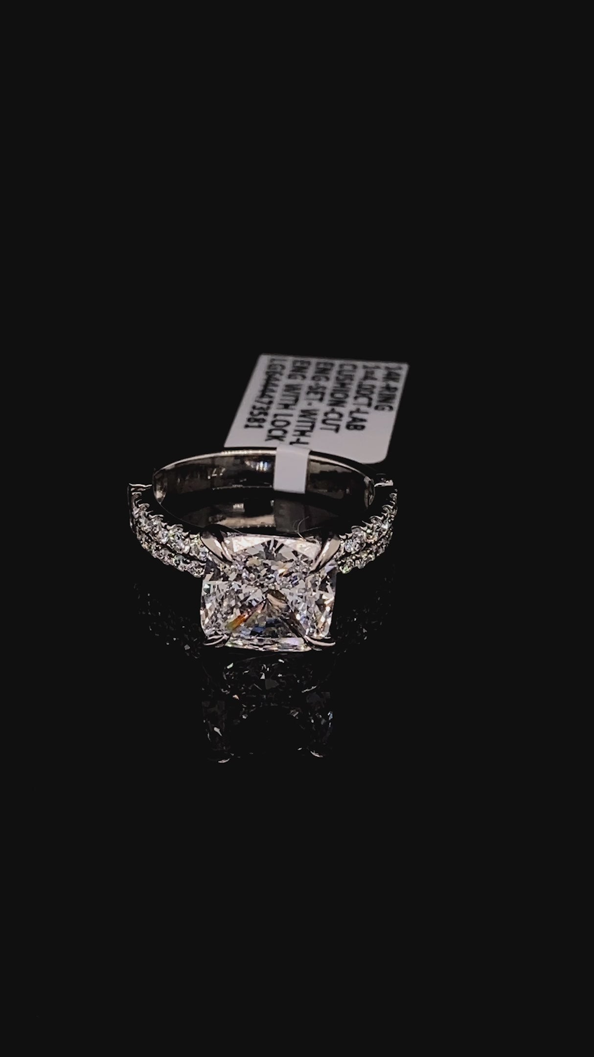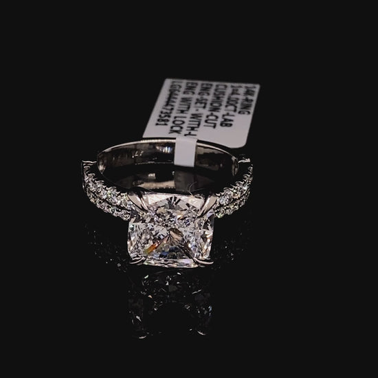 Elevate your engagement with this stunning 14K white gold ring, featuring a magnificent 4.00ct cushion-cut diamond as the centerpiece, complemented by 0.50ct of accent diamonds along the band. Designed with practicality in mind, this piece incorporates a side-mounted locking mechanism that allows the band to open and close—an ideal solution for those with varying finger sizes or thicker knuckles. The secure closure ensures your precious ring stays safely in place while maintaining its elegant aesthetic and exceptional craftsmanship.