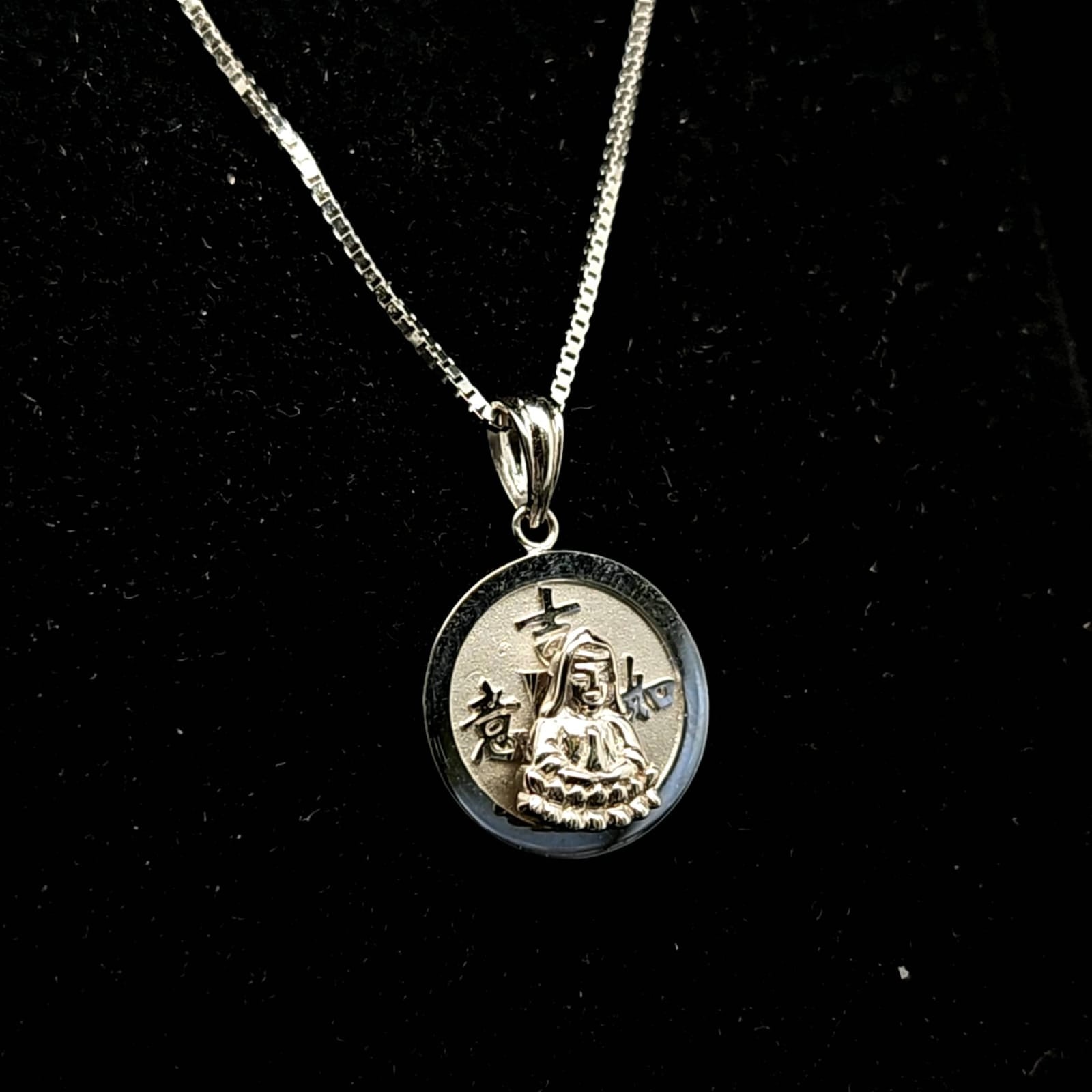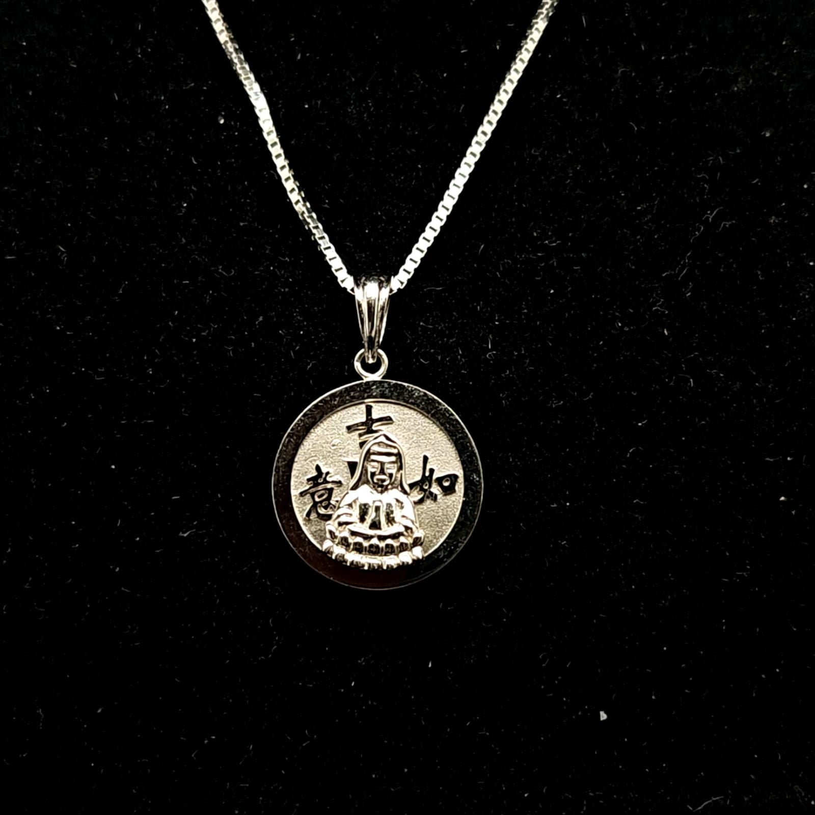 Experience the calming presence of the Lady Buddha necklace. Crafted with 18K white gold, the spinning pendant adds a unique touch to this beautiful accessory. Let the serene energy of the Lady Buddha bring peace to your daily life.